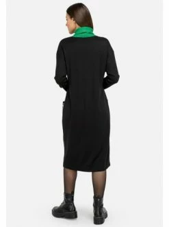 Schwarzes Midikleid aus Strick. Lockere Passform. Mit Rollkragen. Aufgesetzte Taschen. Der Kontrast-Kragen macht das Kleid besonders! – Rollkragen – Gerader Schnitt – LangarmGrößenhinweisfällt größengetreu aus