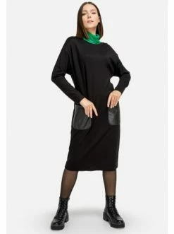 Schwarzes Midikleid aus Strick. Lockere Passform. Mit Rollkragen. Aufgesetzte Taschen. Der Kontrast-Kragen macht das Kleid besonders! – Rollkragen – Gerader Schnitt – LangarmGrößenhinweisfällt größengetreu aus