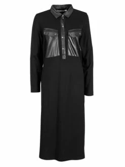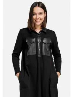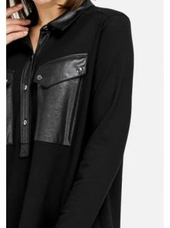 Locker geschnittenes, ausgestelltes Kleid. Hemdkragen. Langarm. Midi-Länge mit Knopfverschluss. Besätze aus Kunstleder. Zwei aufgesetzte Taschen auf der Brust mit Knöpfen – Locker geschnitten – Hemdkragen – Midi-Länge – LangarmGrößenhinweisfällt größengetreu aus