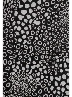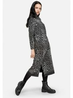 Midikleid aus Strick. Halbdurchsichtige Silhouette. Aufgesetzte Seitentaschen. Stehkragen. Langarm. Einsatz von Öko-Leder am Saum. Kleine Schlitze an den Seiten. Kontrastierender Schwarz-Weiß-Druck. Zum Kleid passt ideal eine kleine Handtasche oder ein Gürtel in leuchtenden Farben. – Rundhalsausschnitt – Gestricktes Gewebe – Seitentaschen – LangarmGrößenhinweisfällt größengetreu aus
