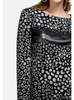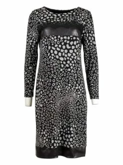 Kleid gerade geschnitten. Länge – unterhalb des Knies. Runder Halsausschnitt. Langarm. Auf der Brust befindet sich ein dekorativer Einsatz aus Spitze. Ein Kleid mit Leopardenprint wird immer relevant sein. Kombinieren Sie es mit groben Stiefeln oder machen Sie einen femininen Look, dank Schuhen mit Absatz. – Rundhalsausschnitt – Langarm – Gerader Schnitt – SpitzeGrößenhinweisfällt größengetreu aus