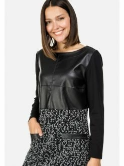 Midikleid mit Kunstlederbesatz. Rundhalsausschnitt. Gerader Schnitt. Langarm. kein Reißverschluss. Zwei Seitentaschen. Würde mit hellen Accessoires toll aussehen. – Langarm – Rundhalsausschnitt – Geprägter Einsatz aus Öko-LederGrößenhinweisfällt größengetreu aus