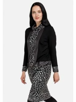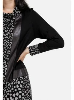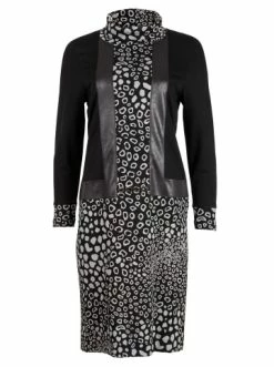 Kontrastreiches Strickkleid mit Nachahmung einer Strickjacke. Kleid mit gerader Silhouette. Stehkragen. Langarm. Einsätze aus Öko-Leder. Ideal sowohl für legere als auch für geschäftliche Anlässe. – Gerade Silhouette – Stehkragen – LangarmGrößenhinweisfällt größengetreu aus