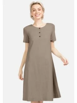 Kleid aus gekochter Baumwolle in der Farbe beige. Das Kleid mit Rundhalsausschnitt und kurzen Ärmeln wird durch Seitentaschen und Knöpfe an der Knopfleiste ergänzt. Das Modell ist eine tolle Option, um einen lässigen Look zu kreieren. Sie können es sowohl mit Absatzschuhen als auch mit Schuhen mit flachen Sohlen, einschließlich Sneakers, tragen. – Lose Auskleidung – Kurze Ärmel – Rundhalsausschnitt – Zwei Seitentaschen – UngefüttertGrößenhinweisfällt größengetreu aus
