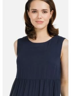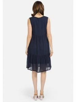 Elegantes Midi-Sommerkleid aus Chiffon. Jede Stufe ist mit kleinen Raffungen verschönert. Ideal für eine feminine Silhouette. – Gestuftes Sommerkleid – Ärmellos – Seitliche Eingrifftaschen – Leicht A-linienförmige SilhouetteGrößenhinweisfällt größengetreu aus