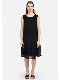 Elegantes Midi-Sommerkleid aus Chiffon. Jede Stufe ist mit kleinen Raffungen verschönert. Ideal für eine feminine Silhouette. – Gestuftes Sommerkleid – Ärmellos – Seitliche Eingrifftaschen – Leicht A-linienförmige SilhouetteGrößenhinweisfällt größengetreu aus