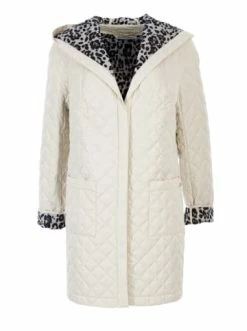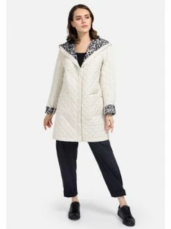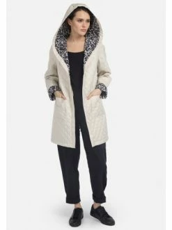 Gesteppte Kapuzenjacke. Kontrastierender Leopardenprint auf dem Futter und der Innenseite der Kapuze. aufgesetzte Taschen. Art des Verschlusses – die Knöpfe. V-förmiger Ausschnitt. Verlängerte Silhouette. – Verlängerte Jacke – Tolles kontrastierendes Futter – Taste oben Taste – aufgesetzte Taschen – Lose Silhouette – Tolles KontrastfutterGrößenhinweisfällt größengetreu aus