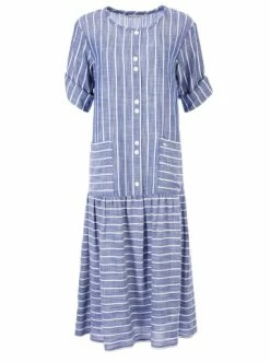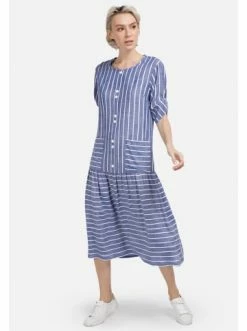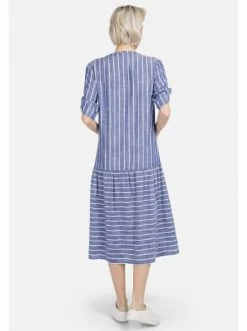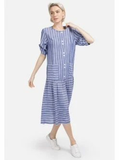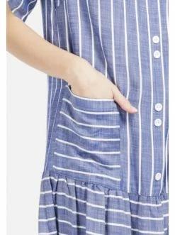 Leichtes fein gestreiftes Midi-Kleid für den Sommer, mit Ärmeln in Dreiviertel-Länge mit weicher Umschlagfalte. Runder Auschnitt. Lockere Passform an der Brust, dekorative Knopfleiste, aufgesetzte Taschen. Das Kleid ist tief-tailliert, mit einem Touch an Raffung am Rock. Romantik und Schwung für jeden Tag. – Lockeres Kleid – Trendy Streifendruck – Deko-Knöpfe als Verschluss – Volant am Saum – RundhalsausschnittGrößenhinweisfällt größengetreu aus