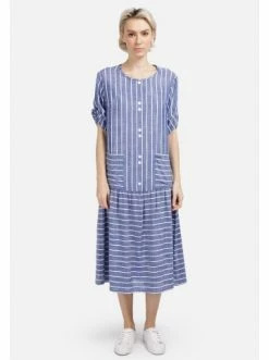 Leichtes fein gestreiftes Midi-Kleid für den Sommer, mit Ärmeln in Dreiviertel-Länge mit weicher Umschlagfalte. Runder Auschnitt. Lockere Passform an der Brust, dekorative Knopfleiste, aufgesetzte Taschen. Das Kleid ist tief-tailliert, mit einem Touch an Raffung am Rock. Romantik und Schwung für jeden Tag. – Lockeres Kleid – Trendy Streifendruck – Deko-Knöpfe als Verschluss – Volant am Saum – RundhalsausschnittGrößenhinweisfällt größengetreu aus