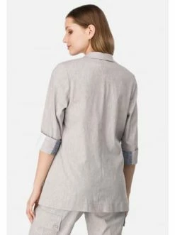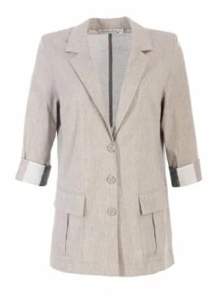 Leichter Sommer Blazer mit Reverskragen und verkürzten Ärmeln mit Kontrast-Manschetten. Aufgesetzte Pattentaschen vorne auf der Jacke, schließt mit drei Knöpfen. Lockere Passform für optimalen Tragekomfort. Perfekt für Büro und Alltag. – Leichte Jacke für Alltag – Lockere Passform – Verschluss mit drei Knöpfen – Manschetten im Kontrast – 7/8 ÄrmelGrößenhinweisfällt größengetreu aus