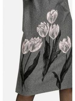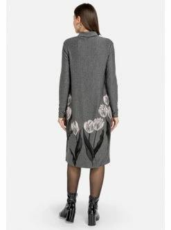 Graues Strick-Midikleid gerade geschnitten. Stehkragen. Langarm. Keine Taschen. Keine Verschlüsse. Signaturdruck – Tulpen. Die Taille kann mit einem Gürtel gestrafft werden und den Look mit Accessoires vervollständigen. – Stehkragen – Druck – Langarm – Gerader Schnitt – Endet unterhalb des KniesGrößenhinweisfällt größengetreu aus