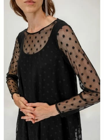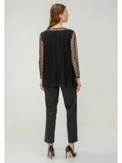 Weit geschnittene Bluse mit gepunktetem Netzdekor für einen eleganten Look. Ideal zum Tragen mit einer klassischen Skinny-Hose oder einem Bleistiftrock. Transparente Details sorgen für ein verführerisches Gesamtbild. – Gerader Schnitt – Lange Ärmel – Transparente Elemente – Polka-Punkte – RundhalsausschnittGrößenhinweisfällt größengetreu aus