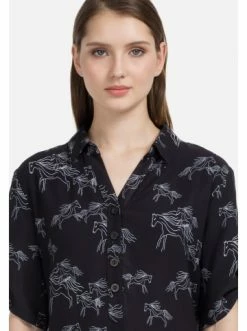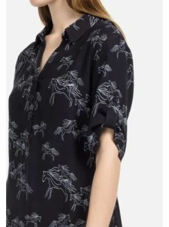 Der klassische Stil und das Fehlen von zusätzlichen Details machen das Kleid luftig und bequem. Kleid mit Pferde-Motiv. Edle blaue Farbe und Streifendetails am Saum verschlanken und strecken jede Figur. Die Midi-Länge macht das Bild interessanter und einprägsamer. Eine todsichere Variante für diesen Sommer! – Gerade Silhouette – Kurzärmelig – Pferde-Print – TaschenGrößenhinweisfällt größengetreu aus