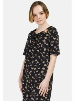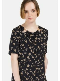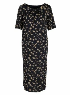 Midi-Kleid in marineblauer Farbe mit einem kalten Viskose-Druck. Der Ausschnitt ist mit einer goldenen Kette eingefasst, die einen Raffeffekt erzeugt. Dieses sehr raffinierte und elegante Produkt wird jede Frau schmücken. Perfekt für alltägliche Looks, aber auch für besondere Anlässe. – Ungefüttert – Kurze Ärmel – Rundhalsausschnitt – Kalt-ViskoseGrößenhinweisfällt eine Nummer kleiner aus