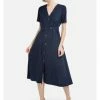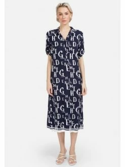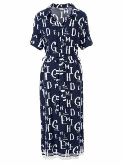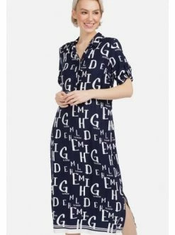 Leichtes Hemdkleid in Midilänge, gerade geschnitten, mit englischem Kragen und Knopfleiste. Modischer und origineller Logo-Print. Perfektes Kleid für einen Sommertag. – Moderner Druck – Knopfleiste – 3/4 Ärmel mit Knopfleiste – Hemdkragen – FreizeitkleidGrößenhinweisfällt größengetreu aus