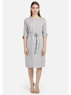 Midi-Kleid, gerade geschnitten, in unterer Knielänge. Ein dekorativer Bindergurt unterstreicht schmeichelhaft die Taille. Runder Auschschnitt. Ärmel in 3/4 Länge mit weichem Umschlag. Originelle Logo-Elemente. Einfaches, jedoch stillvolles Kleid für jeden Tag. – Midikleid mit geraden Schnitt – Rundhalsausschnitt – 3/4-Ärmel – Inklusive Gürtel – Weicher StoffGrößenhinweisfällt größengetreu aus