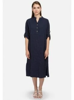 Das Kleid ist in einem edlen Dunkelblau aus Baumwolle gehalten. Ideal für Spaziergänge am Meer und in der Stadt bei warmem Wetter. An der Taille befinden sich an den Knöpfen Aufnäher, die die Taille der Trägerin betonen. – Kleid zum Knöpfen – Kein Futter – Gerade Silhouette – Knittereffekt bei StoffenGrößenhinweisfällt größengetreu aus