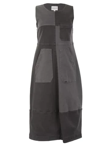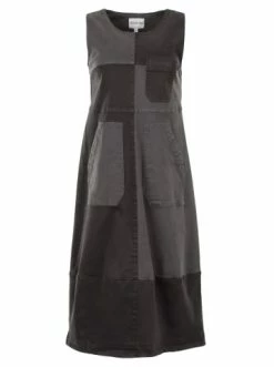 Denim-Sommerkleid im Color-Block-Stil. Hoch tailliertes Design aus weichem Denim. – Ohne Schnalle – Ungefüttert – Midi-Länge – 3 aufgesetzte Taschen – Breite TrägerGrößenhinweisfällt größengetreu aus