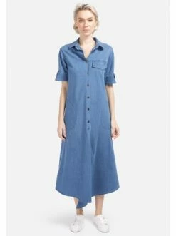 Denim-Maxi-Langarm-Shirtkleid aus leichtem und weichem Stoff mit dem Zusatz von Eukalyptus-Lyocell, einem umweltfreundlichen Eukalyptus-Material. – Maxi-Länge – Kurzärmelig – A-Silhouette – Denim – Mit Hemdkragen – KurzarmGrößenhinweisfällt größengetreu aus