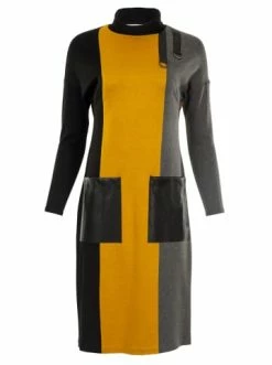 Gerade geschnittenes Strickkleid im Farbblock-Stil. Aufgesetzte Taschen und dekorative Elemente an der Schulter aus Kunstleder. Gemütliches und helles Kleid für Herbstlooks. – Lockere Passform – Aufgesetzte Taschen aus Kunstleder – Stehkragen – Gerade Silhouette – UngefüttertGrößenhinweisfällt größengetreu aus