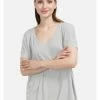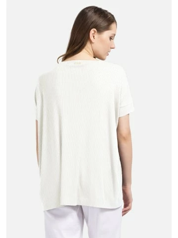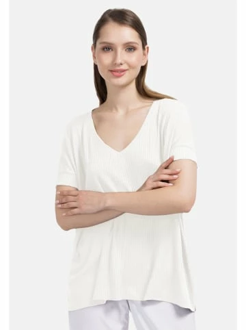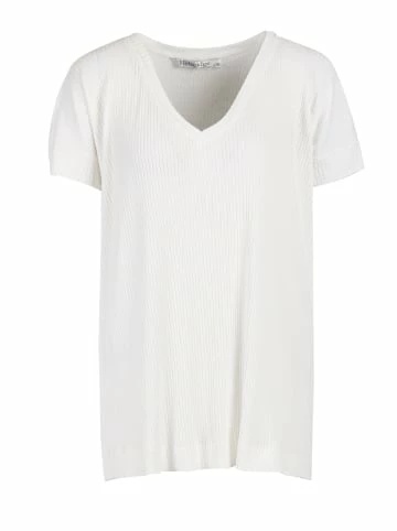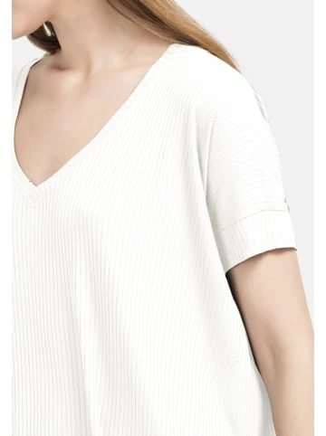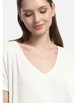 Locker geschnittene Bluse mit V – Ausschnitt. Das Modell ist aus elastischem Jersey mit Ripp-Struktur gefertigt. Gut kombinierbar sowohl mit klassischer als auch mit legerer Garderobe. – Gerader Schnitt – Kurzarm – Mit V-Ausschnitt – Asymmetrischer Saum – Lose PassformGrößenhinweisfällt größengetreu aus