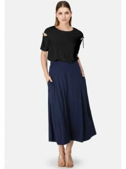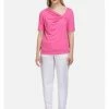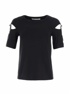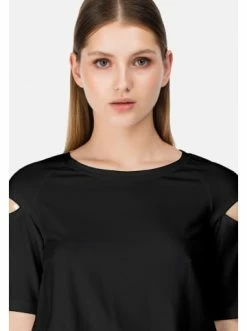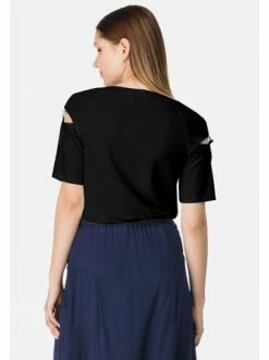 Sportlich-schicke Bluse aus weichem Jersey mit kurzen Ärmel und rundem Ausschnitt. An den Ärmel sind dekorative Schlitze mit Schnalle in der Halb-Ring Form angebracht. – Lose Bluse – Kurze Ärmel – Schlitze an den Ärmeln – Ohne Verschluss – RundhalsausschnittGrößenhinweisfällt größengetreu aus