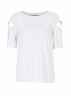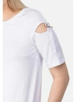 Sportlich-schicke Bluse aus weichem Jersey mit kurzen Ärmel und rundem Ausschnitt. An den Ärmel sind dekorative Schlitze mit Schnalle in der Halb-Ring Form angebracht. – Lose Bluse – Kurze Ärmel – Schlitze an den Ärmeln – Ohne Verschluss – RundhalsausschnittGrößenhinweisfällt größengetreu aus