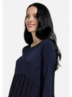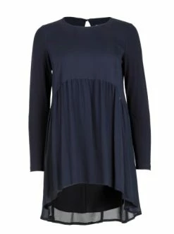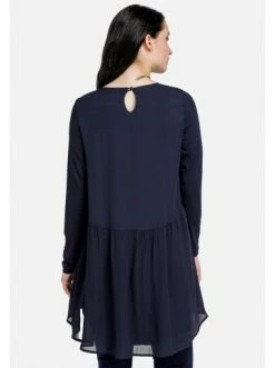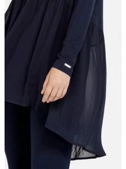 Marineblaue Freizeitbluse mit Fransen. Asymmetrische Länge. Knopfverschluss auf der Rückseite mit einer Schlaufe. – Langarm – Knopfverschluss auf der Rückseite – Rundhalsausschnitt – Ärmel-Logo – Bluse mit FransenGrößenhinweisfällt größengetreu aus