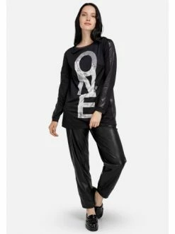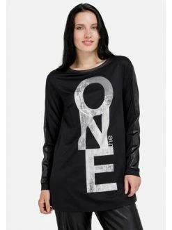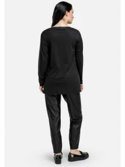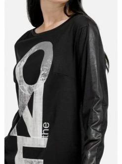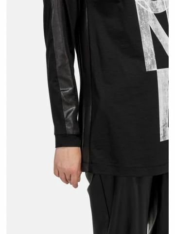 Schwarz bedruckte Bluse. Öko-Ledereinsätze an den Ärmeln. Langärmeliges Oberteil. Runder Halsausschnitt. Ohne Klammern. – Langarm – Rundhalsausschnitt – Bequem und hochwertigGrößenhinweisfällt größengetreu aus