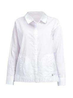 Langärmelige Bluse. Geknöpft. Hemdkragen. Zwei Seitentaschen mit dekorativen Einfassungen. Ungewöhnliches, stilvolles weißes Hemd, wird in Ihren Bürostil passen. – Geknöpft – Hemdkrgaen – Langarm – Gerader Schnitt – Ornamentale VerzierungenGrößenhinweisfällt größengetreu aus