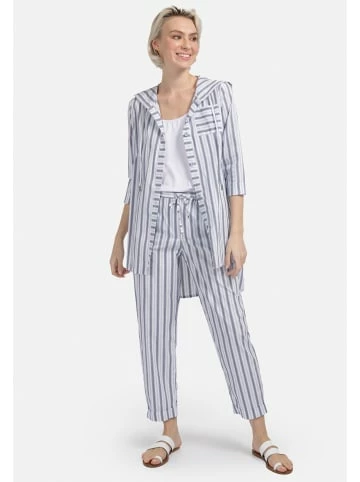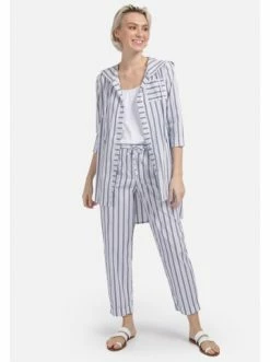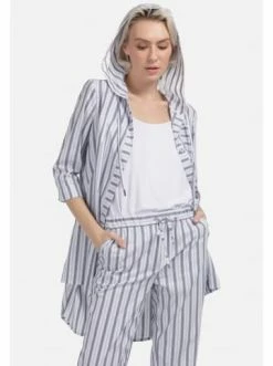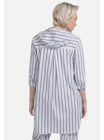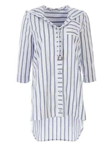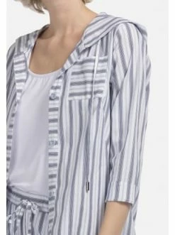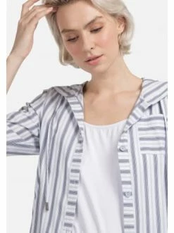 Bluse im sportlichen Stil in mittlerer Hüftlänge. Kordelzug am Saum der Bluse mit verstellbarem Gummielement. Verkürzte Ärmel sind mit dekorativer Borte geschmückt. In der Kapuze ist ein Kordelzug angebracht, mit Bändchen im Logo-Print. Am vorderen Teil sind große aufgesetzte Taschen mit dekorativen Falten. Die elastische Baumwolle liegt angenehm am Körper. – Sommerbluse mit längerem Schnitt – Knopfleiste – Kapuze mit Kordelzug – Trendy Streifendruck – 7/8-ÄrmelGrößenhinweisfällt größengetreu aus