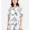Verlängerte, locker geschnittene Bluse. Dieses Modell ist mit Originaleinsätzen und Kontrastbesätzen verschönert. Sie ist perfekt geeignet für die Arbeit und formelle Anlässe. – Lose Passform – Kurzarm – Strukturierte Einsätze – Verlängerter SchnittGrößenhinweisfällt größengetreu aus