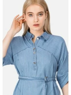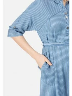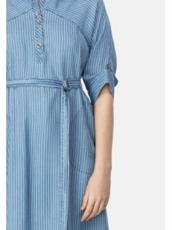 Fein gestreiftes Midi-Denimkleid mit verkürzten Ärmeln, Ballonschnitt und dekorativem Bindegurt. Das Kleid verfügt über einen Hemdkragen mit Polo-Knopfverschluss, sowie Eingriff-Taschen. Ein femininer Look für jeden Tag, wunderschön sowohl mit hohen Sandaletten als auch mit flachen Schuhen. – Feminine, taillierte Form – Gestreifter Druck – Taille wird durch Gürtel betont – Polo-Kragen – 3/4-Ärmel mit KnopfleisteGrößenhinweisfällt größengetreu aus