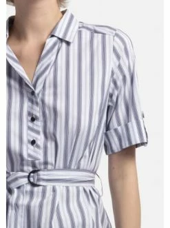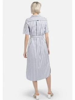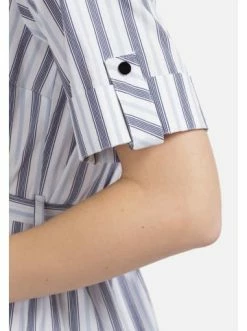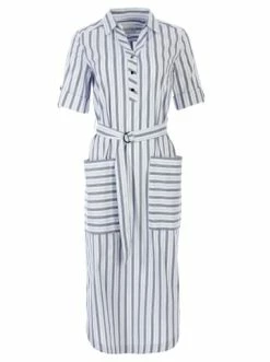 Sommerliches Midi-Kleid aus elatischem Stoff mit gestreiftem Muster, gerade geschnitten. Der Bindegurt unterstreicht die Taille, der Saum ist abgerundet. Das Kleid hat kurze Ärmel mit Umschlag, V-Ausschnitt und Hemdkragen. Die Polo-Knopfleiste und zwei große aufgesetzte Taschen runden das Stück ab. Ein leichtes Kleid für jeden Sommertag. – Hemdkleid in Midilänge – Kurze Ärmel – Knopfleiste – Taille wird durch Gürtel betont – Polo-KragenGrößenhinweisfällt größengetreu aus