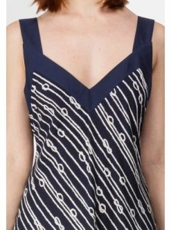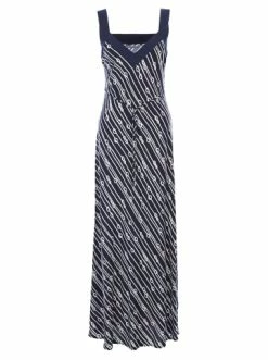 Offenes sommerliches Maxi-Kleid in A-Linie, ärmellos mit breiten Schulter-Trägern und einem fantasievollen Seilenmuster. Leichtes romantisches Kleid für heiße Tage. – Sommer Maxikleid mit breiten Trägern – Tiefer Ausschnitt – Marine-Print in Schwarz – A-LinienkleidGrößenhinweisfällt größengetreu aus