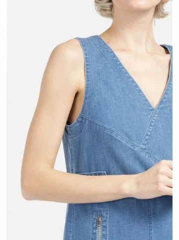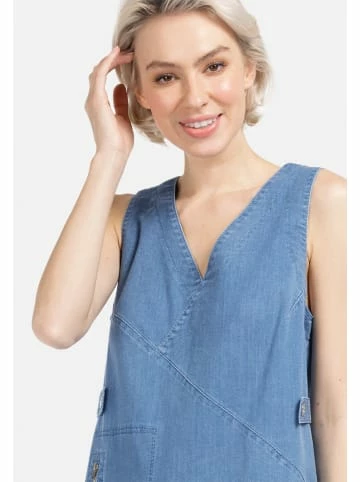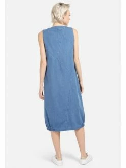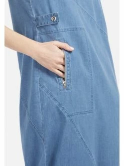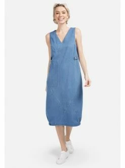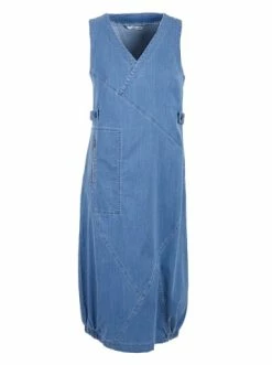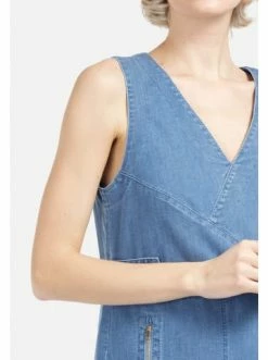 Locker geschnittenes Denim-Sommerkleid. Breite Schulterträger, Krepp-Ballon-Stil. Bequemes Modell für entspannte Looks. – Ballon-Form – V-Ausschnitt – Zwei Seitentaschen – Helles Denim – Mit SeitenriegelnGrößenhinweisfällt größengetreu aus
