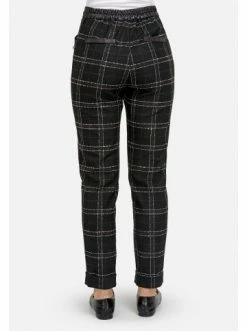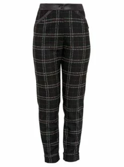 Karierte gerade Hose mit Öko-Ledereinsätzen. Reißverschluss und Knopf. Hinten elastischer Bund. Zwei Seitentaschen. Der stets modische Teil der Garderobe. Kombiniert mit Rollkragenpulli und Kragen oder Hemd. – Gerader Schnitt – Seitentaschen – Reißverschluss – Kunstleder-BesätzeGrößenhinweisfällt größengetreu aus