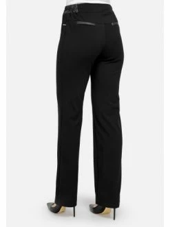 Klassische schwarze gerade Damenhose. Mit Reißverschluss. Gürtel mit Gummiband. Verziert mit dem Markenlogo. – Gerader Schnitt – Keine Taschen – Reißverschluss – Geprägter Einsatz aus Öko-LederGrößenhinweisfällt größengetreu aus