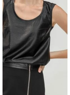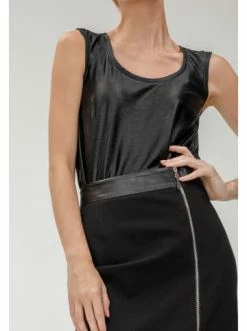 Stretch-Träger-Top. Nass-Effekt sorgt für eine schimmernde Optik. Die Silhouette ergänzt perfekt Looks mit Jacken oder Röcken und Hosen. – A-Silhouette – Seidenstoff-Effekt – Rundhalsausschnitt – Breite Träger – Glanz-EffektGrößenhinweisfällt größengetreu aus