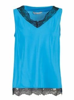 Gerade geschnittenes Oberteil mit Spitzenbesatz. Verfeinertes Basismodell für warme Tage. Das Bild kann durch Denim, Jacken und Hemden ergänzt werden. – Gerader Schnitt – V-Ausschnitt – Keine Schnalle – Spitzenbesatz – Spitze trimmen – Spitzenveredelung – Ohne SchnalleGrößenhinweisfällt größengetreu aus