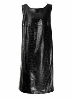 Locker geschnittenes Trägerkleid aus Kunstleder. Die Länge reicht bis zum Knie. Muster – Krokodil. Dekorative Nähte auf der Brust. Zwei Seitentaschen. Kann mit Hemden, Rollkragenpullovern und T-Shirts getragen werden. – Locker geschnitten – Ärmellos – Kunstleder – Aufgesetzte TaschenGrößenhinweisfällt größengetreu aus