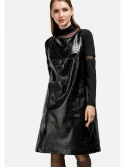 Locker geschnittenes Trägerkleid aus Kunstleder. Die Länge reicht bis zum Knie. Muster – Krokodil. Dekorative Nähte auf der Brust. Zwei Seitentaschen. Kann mit Hemden, Rollkragenpullovern und T-Shirts getragen werden. – Locker geschnitten – Ärmellos – Kunstleder – Aufgesetzte TaschenGrößenhinweisfällt größengetreu aus