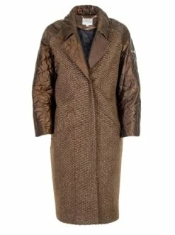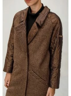 Mantel mit der Silhouette eines Kokons. Das Modell wird durch die originelle Kombination von zwei Texturen verschönert. Die Kombination aus Schnitt und Stoff schafft ein aktuelles und bequemes Bild für den Herbst. – Midi-Länge – Natürliche Wolle – Lockere Passform – Button-up-KnopfGrößenhinweisfällt größengetreu aus
