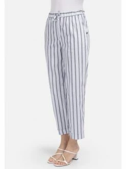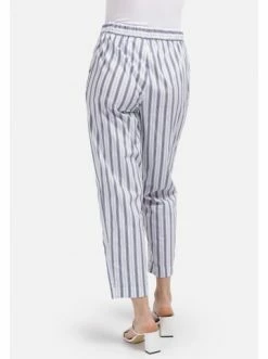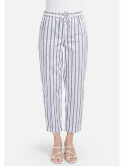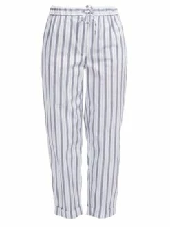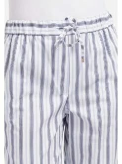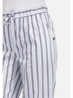 Schmal zulaufende gestreifte Sommerhose mit zwei Taschen, mittelhoch, im modischem Pyjama-Look. Gummierter Taillenbund garantiert perfekte Passform und idealer Tragekomfort. Eine schöne Hose für den Sommer. – Gerade Hose – Loose Fit – Bequemer Gummibund mit Kordelzug – Trendy Streifendruck – 7/8 LängeGrößenhinweisfällt größengetreu aus