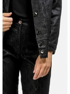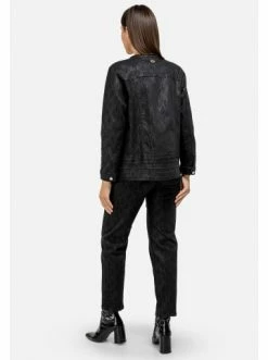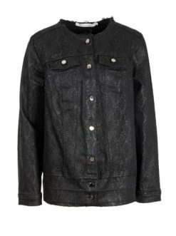 Bedruckte Jeansjacke. Gerundeter Halsausschnitt. Zwei aufgesetzte Taschen auf der Brust mit Knöpfen. Sie wird mit Knöpfen geschlossen. Unbeschnittene Kanten. Kombinieren Sie die Jacke mit einer dunklen Hose oder einem Bleistiftrock. – Geknöpft – Rundhalsausschnitt – Gerader Schnitt – Reptilien-MusterGrößenhinweisfällt größengetreu aus