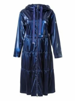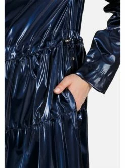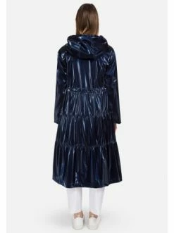Gerader, langer Mantel gefüttert, mit langen Ärmeln. Reißverschluss. Dekoriert mit aufgesetzten Taschen vorne, feste Kapuze mit Tunnelzug. Volant am Saum, mit Kordelzug in der Taille. – Glänzende Optik – A-Linie – Reißverschluss – Kapuze mit Kordelzug – Seitentaschen – Midi-MantelGrößenhinweisfällt größengetreu aus