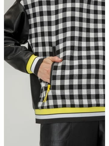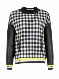 Marinefarbenes Karo-Sweatshirt im trendigen, sportlich-schicken Stil. Ausgestellte Ärmel aus Kunstleder. Kontrastfarbene Abschlüsse an Ärmeln, Saum und Taschen. Mit geprägtem Markenlabel am Ausschnitt. Mit kontrastfarbenen Bündchen, Saum und Taschen. – Modischer Karodruck – Ärmel in Leder-Optik – Strassbesatz an Manschetten und Saum – Reißverschlusstaschen – Trendiger KarodruckGrößenhinweisfällt größengetreu aus